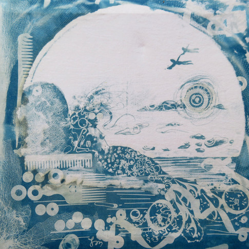 In early 2020, I was asked by local artist, Renee Foster, to show a work of art that expressed themes of folklore and folk art. I have always admired the work of the late Grenadian folk artist, Canute Caliste. I was lucky enough to view his work many times at the now closed gallery, The Art Upstairs in St. George's. Meg Conlon, the owner of the gallery, shared with me stories of Mr. Caliste. It is said that when he was a young boy in Carriacou, he saw a mermaid combing her hair down by the water. He had visions of flying around the islands and after this experience he began painting. I am inspired by the way his work portrays a flattened perspective and how he uses shapes and blocks of color. I decided to pay homage to his work by making a mermaid of my own. I exposed hair combs from my collection of found beach items in the composition. I used lentils, rice, rubber bands, ribbons and small sequins in her tail. The following photographs show my process.